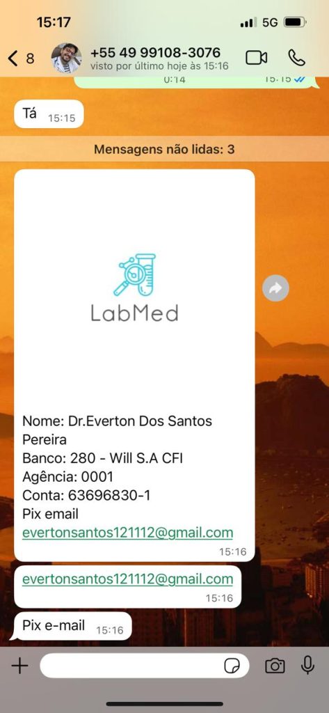 A filha da paciente, Marcelina Pereira, conta que recebeu mensagens de um homem que se identificou como “Dr. Marcos Lopes” solicitando dinheiro, no valor de R$ 4,990,00, para compra do medicamento. O criminoso alegou que o medicamento é fornecido pelo SUS, mas que demorava quatro dias para ser liberado e que a paciente precisava tomá-lo em até 48 horas, caso contrário, morreria.