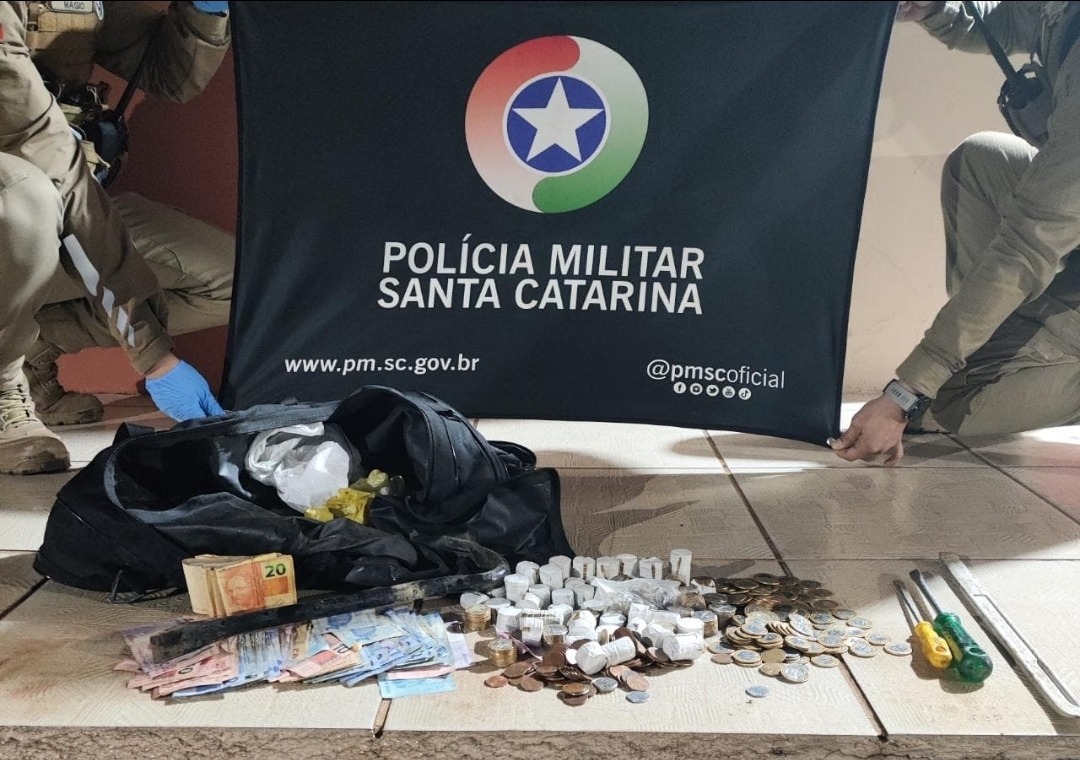 Durante a revista pessoal e no interior do automóvel, os policiais localizaram R$ 2.004,05 escondidos em diferentes pontos do veículo, indicando que os suspeitos estavam dividindo o dinheiro no momento da abordagem. Também foram apreendidos uma bolsa contendo ferramentas utilizadas no arrombamento e o carro usado na ação criminosa.