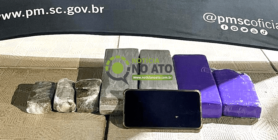 Durante a busca veicular, os policiais encontraram um saco preto contendo cerca de três quilos de maconha aos pés do motorista. Também foi apreendido um telefone celular, que será periciado. No momento da abordagem, o suspeito estava acompanhado da esposa e do neto menor de idade.