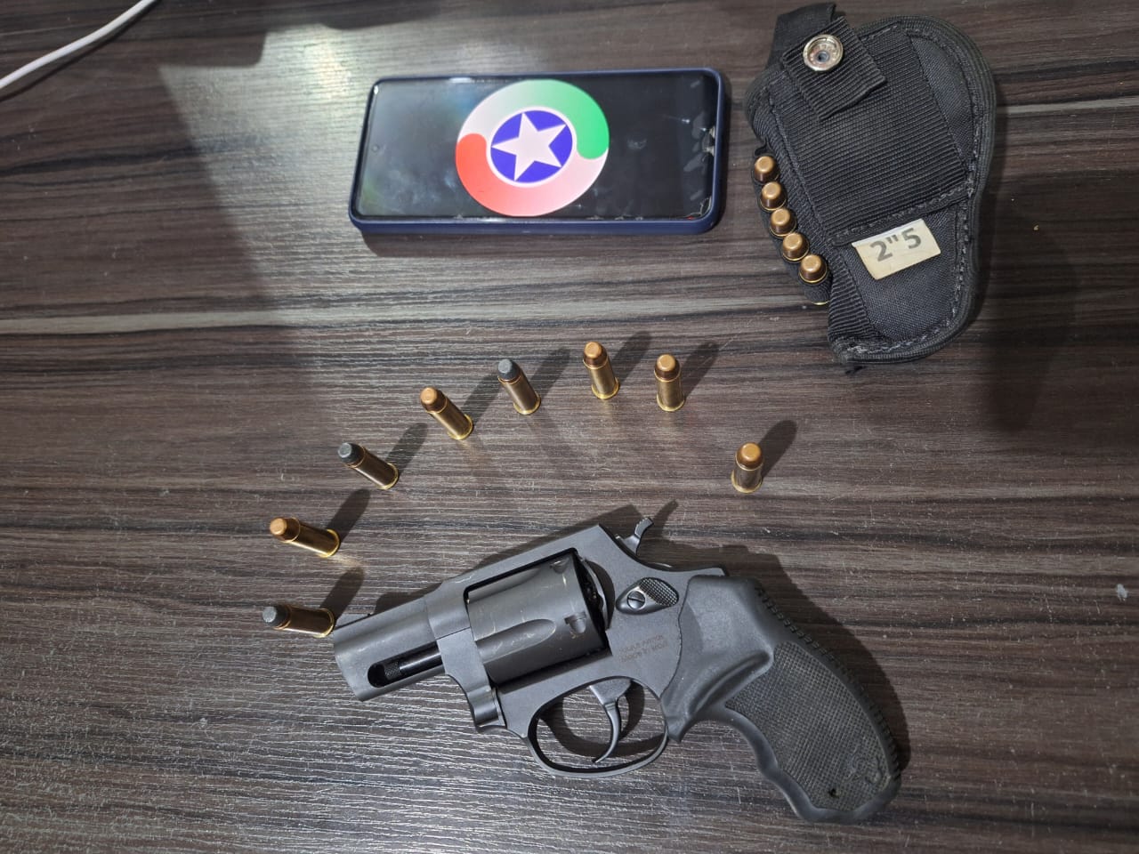 Durante a busca no interior do automóvel, os policiais encontraram um coldre vazio na porta do motorista contendo seis munições calibre .357. Na revista pessoal dos ocupantes, foi localizado com um deles um revólver Taurus calibre .357, carregado com cinco munições. Em seguida, a guarnição encontrou ainda outras três munições do mesmo calibre dentro de uma pochete, totalizando 13 munições intactas.
