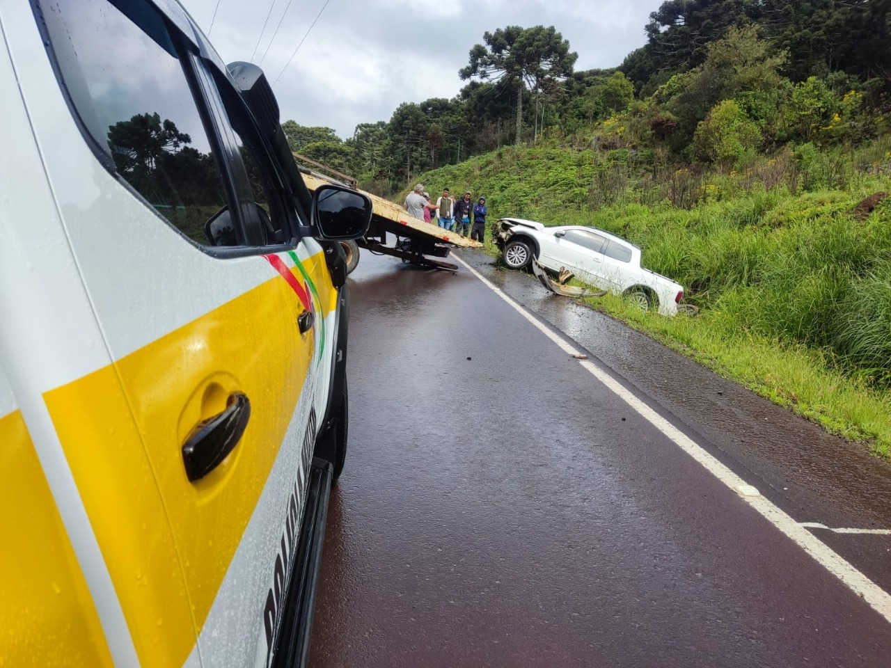 Um sinistro de trânsito foi registrado na tarde deste sábado (22), por volta das 14h30, na SC-370, Km 16,7, em Painel. Um veículo VW Saveiro saiu da pista e tombou em um barranco após aquaplanagem.