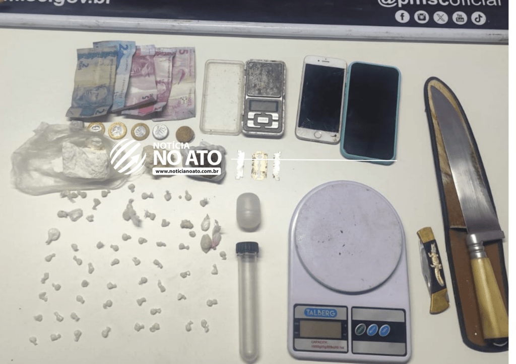 Ainda conforme relato policial, na porta da residência onde ocorreu a abordagem foram visualizadas diversas porções de substância análoga ao crack, já fracionadas e prontas para venda, além de uma balança de precisão e dinheiro em espécie. Diante da situação de flagrante, foi dada voz de prisão ao suspeito, com a devida ciência de seus direitos constitucionais.