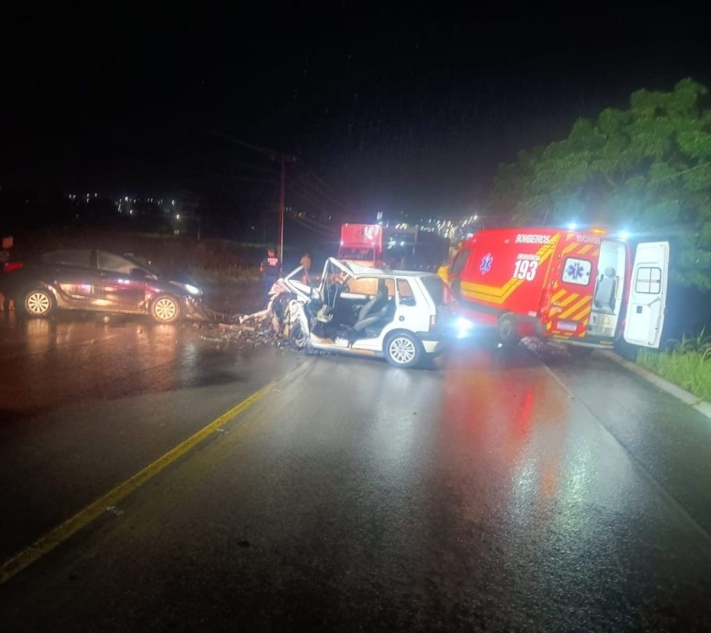 Segundo o Corpo de Bombeiros, as guarnições das viaturas ASU-592 e ABTR-206 foram acionadas para atender a uma colisão envolvendo dois veículos: um Hyundai HB20 preto e um Fiat Uno branco.