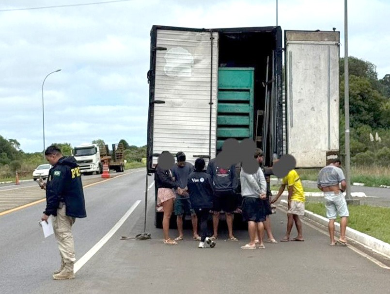 Na manhã desta segunda-feira (23), durante fiscalização na BR-282 em Campos Novos, policiais rodoviários federais flagraram seis pessoas sendo transportadas irregularmente dentro do compartimento de carga de um caminhão.