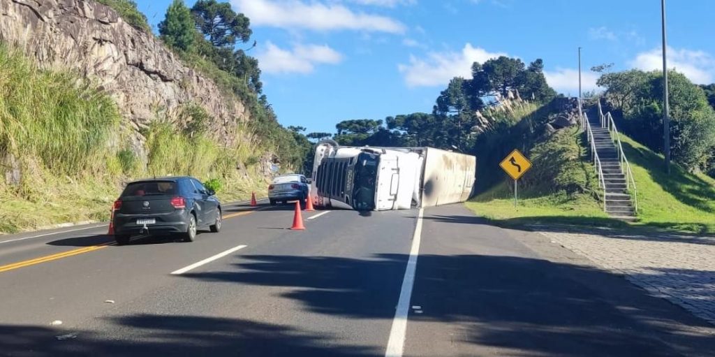 De acordo com a Polícia Militar Rodoviária (PMRv), a guarnição foi acionada para atender um sinistro de trânsito sem feridos. No local, os policiais encontraram um caminhão trator Scania R 400 A6x2, acoplado a um semirreboque Facchini, ambos com placas de Lages (SC), tombado sobre a pista contrária. O veículo transportava carga de paletes de maçã.