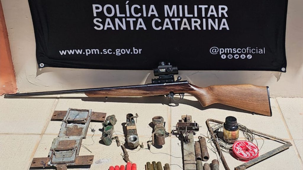 Na busca veicular, foi encontrado um rifle calibre .22 da marca CBC, com luneta Bushnell, além de munições de diferentes calibres, espoletas, armadilhas e artefatos artesanais. Próximo ao galpão, também foram localizadas partes de animal silvestre, possivelmente javali, abatido recentemente.