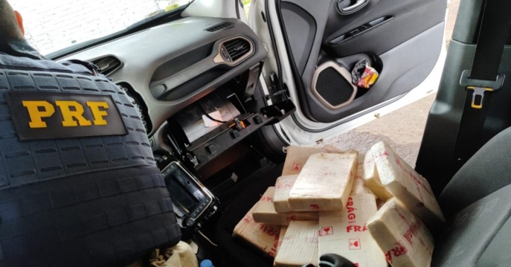 Após uma inspeção minuciosa, os PRFs localizaram diversos tabletes da droga escondidos no interior do painel do veículo, totalizando mais de 37 quilos.
