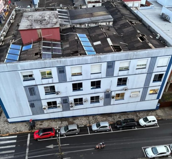 Lages (SC) – Um forte temporal, com ventos intensos e chuva volumosa, atingiu Lages na tarde deste domingo (30) e provocou diversos estragos, incluindo o destelhamento parcial da cobertura do Hospital Nossa Senhora dos Prazeres. Moradores de edifícios próximos registraram o momento em que parte da estrutura do telhado foi arrancada pela força do vento.
