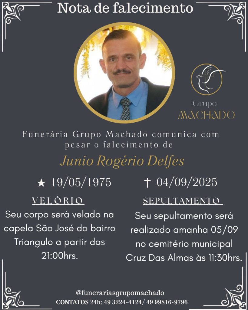 O velório de Junio Delfes inicia às 21h desta quinta-feira, na Capela São José, do bairro Triângulo em Lages.