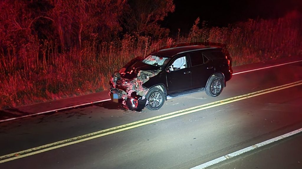 A Polícia Militar Rodoviária, por meio da guarnição do Posto 11 de Palmeira, atendeu na noite desta sexta-feira (19) um sinistro de trânsito na SC-390, em Capão Alto. A ocorrência, comunicada pelo SAMU de Lages, envolveu uma caminhonete Toyota Hilux SW4 que atropelou uma vaca que invadiu repentinamente a pista no km 229,400.