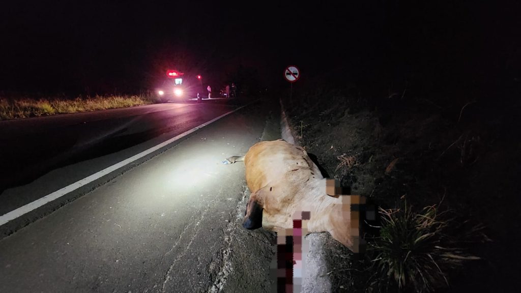 O veículo, conduzido por um homem de 61 anos, sofreu danos de média monta e precisou ser removido por guincho. O motorista teve lesões corporais leves e o animal morreu no local. O proprietário da vaca, de 71 anos, compareceu à cena, ficou responsável pela retirada da carcaça e se comprometeu a comparecer ao Juizado Especial Criminal por omissão de cautela na guarda do animal.