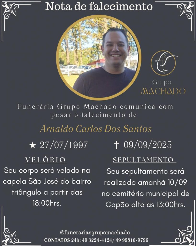 O velório acontece na Capela São José, no bairro Triângulo, em Lages, a partir das 18h. O sepultamento será realizado nesta quarta-feira (10), às 13h, no Cemitério Municipal de Capão Alto.