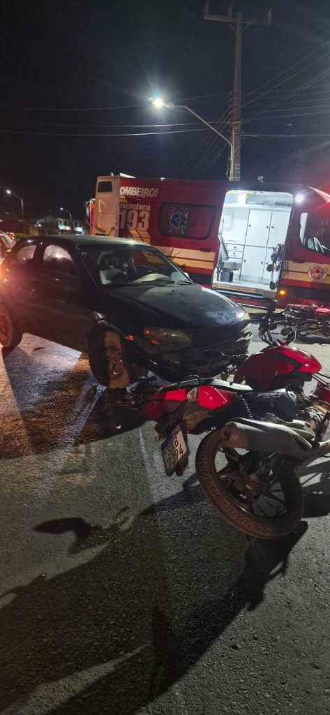 A batida envolveu um veículo Celta, qual era conduzido por uma mulher de 35 anos, que não se feriu e a moto citada. O piloto foi encontrado pelos Bombeiros na via, em decúbito lateral esquerdo, orientado, consciente, referindo dor na perna direita e parte anterior do tórax, luxação de patela, fratura fechada desalinhada em tíbia e fíbula, foi realizado curativo na lesão abrasiva, imobilização com tala rígida na fratura estabilizado em maca rígida com colar cervical e conduzido ao hospital.