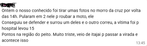 Na tarde de segunda-feira (29), por volta das 14h, mais um caso grave foi registrado. Um visitante, foi até o Morro da Cruz para tirar fotos quando foi surpreendido por dois suspeitos, que tentaram roubar sua motocicleta.