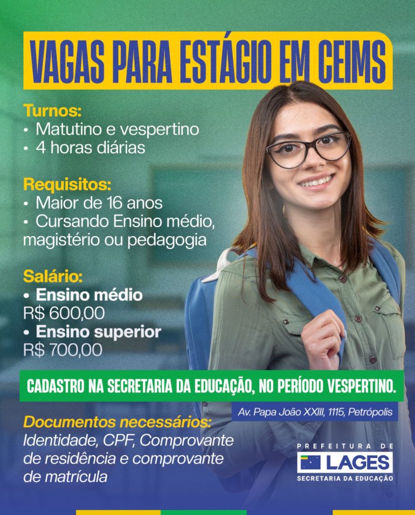 Em Lages, a Secretaria da Educação está com vagas abertas para contratação de estagiárias com o intuito de atuação nos Centros de Educação Infantil Municipais (Ceims). As oportunidades são para o turnos matutino e vespertino e abrangem unidades de ensino de várias regiões de Lages. A jornada de trabalho é de quatro horas diárias. As inscrições devem ser realizadas presencialmente na Secretaria Municipal da Educação (SMEL), no horário das 14h às 18h.